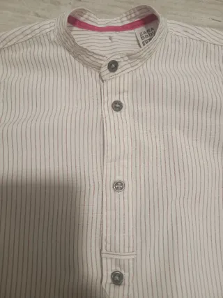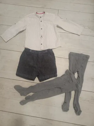 Conjunto de ropa para bebé niño de 2 años. - Camisa blanca de rayas finas con cuello mao Zara - Pantalón corto gris con botones Mayoral - Leotardos grises Condor