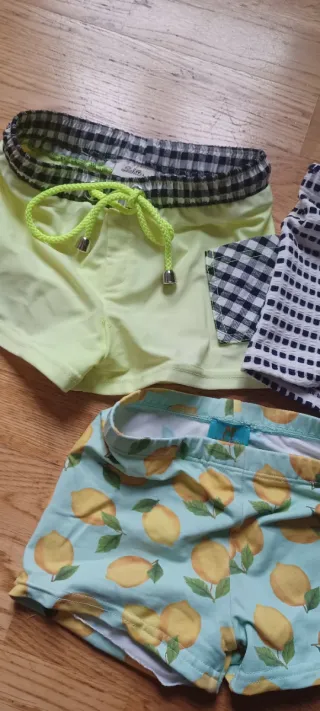 Conjunto de tres bañadores para niño con diferentes estampados. - Bañador amarillo liso con cordón. - Bañador de cuadros blanco y azul marino. - Bañador con estampado de limones. La Martinica y Lolittos Talla 5
