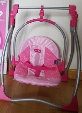 Se venden un columpio y un andador para bebé. Ambos están en buen estado. - El columpio es azul y tiene un diseño alegre. - El andador es rosa y tiene luces y sonidos. - Ideales para entretener a los más pequeños.
