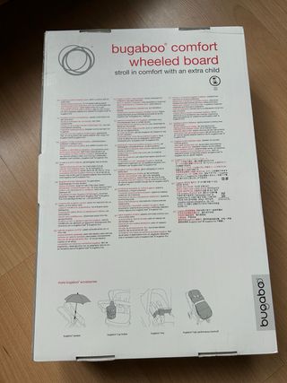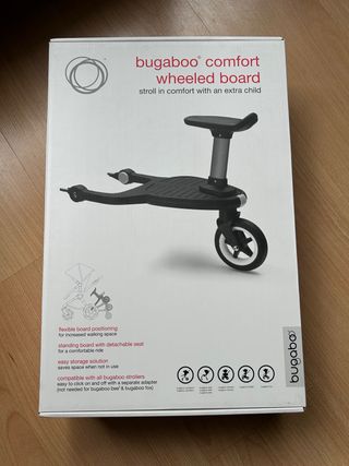 Patinete Bugaboo Comfort Wheeled Board para cochecitos. - Posicionamiento flexible para mayor espacio al caminar. - Tabla de pie con asiento desmontable para un paseo cómodo. - Solución de fácil almacenamiento, ahorra espacio cuando no está en uso. - Compatible con todos los cochecitos Bugaboo. - Fácil de colocar y quitar con un adaptador aparte (no necesario para Bugaboo Bee y Bugaboo Fox).