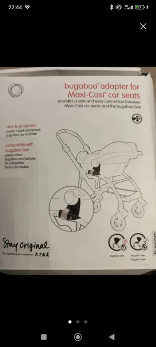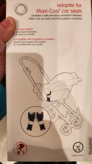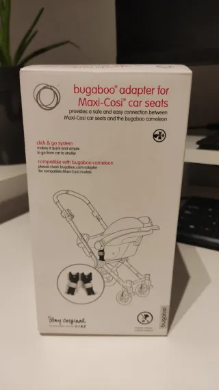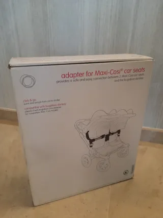 Adaptador Bugaboo para sillas de coche Maxi-Cosi. - Permite una conexión segura y fácil entre las sillas de coche y el Bugaboo Fox. - Sistema click & go para un montaje rápido. - Compatible con marcas adicionales de sillas de coche. Hago envíos