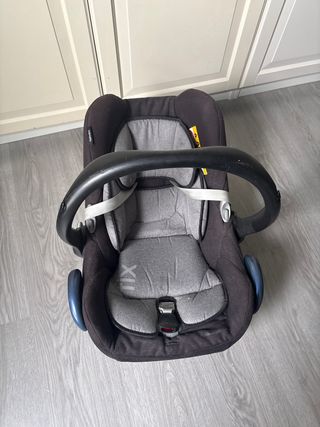 Cuco Maxi-Cosi para bebé, adaptable como silla de coche o carro. Diseñado para la seguridad y comodidad del pequeño. - Color negro y gris. - Asa de transporte. Se puede adaptar q cualquier carro de bebe con adaptador, nosotros lo usamos con bugaboo. Esta usado pero en perfecto estado. En foto se ve el color de la tela mas estropeada.