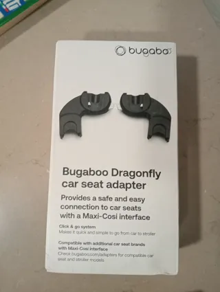 Adaptador para silla de coche Bugaboo Dragonfly. - Permite una conexión segura y fácil a sillas de coche con interfaz Maxi-Cosi. - Sistema Click & go para un montaje rápido. - Compatible con marcas adicionales de sillas de coche con interfaz Maxi-Cosi.