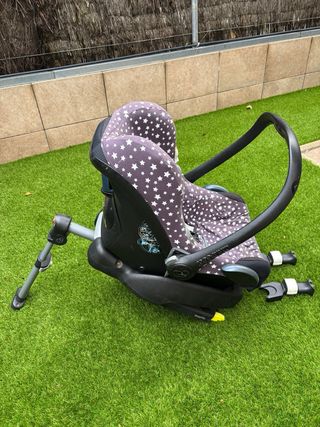 Maxi-Cosi con base Isofix para facilitar la instalación en el coche. - Silla de coche con diseño ergonómico. - Base con sistema Isofix. Se trata de una silla maxicosi con su base para el coche que se adapta a Isofix. La plataforma queda fija en el coche y la silla la puedes adaptar por ejemplo al carro Bugaboo y así no despiertas al bebe cuando lo sacas del coche. Es del grupo 0 y es el modelo cabriofix.Tiene también como se ve en la foto un toldito para q no le dé el sol o la luz.