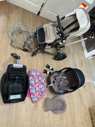 Grupo 0 maxicosi con adaptadores de bugaboo fox, base isofix para el coche. Incluye funda para la silla con capota y almohadillas para los primeros meses de recién nacido. Están en buen estado nada roto.