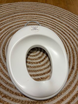 Reductor de WC de la marca BabyBjörn en color blanco y gris. Diseñado para facilitar la transición al inodoro. Mi hijo lo utilizó hasta los 6 años porque le era mucho más cómodo poder apoyar todo el culete. Se adapta a cualquier taza de inodoro. Se puede colgar para que sean ellos mismos quienes lo cojan y lo pongan. Dispongo de 2 unidades. - Forma ergonómica. - Fácil de limpiar. - Asa para colgar.