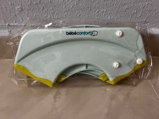 Lote de reductor de WC plegable y portátil junto con un protector para silla de coche. Incluye: - Reductor de WC de plástico marca Bebé Confort. - Protector de silla para escapes de pipí con estampado de hipopótamos en tonos verdes y borde naranja.