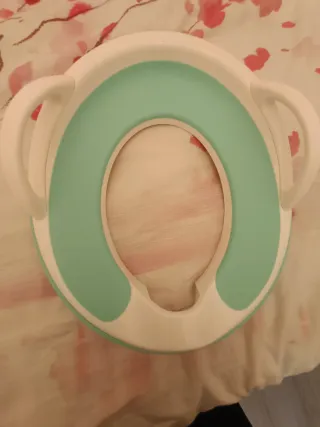 Adaptador para el water de niños, diseñado para facilitar la transición al inodoro. - Color blanco y verde menta. - Asiento ergonómico. - Con asas laterales para mayor seguridad. Sólo lo ha utilizado un par de veces
