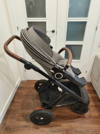 Conjunto STOKKE XPLORI Precioso carro de bebé, la misma estructura se adapta a la silla de paseo (cuco)y también para coche grupo cero más el capazo más la silla de paseo. Todo es regulable en altura y dirección delantera y trasera. Incluye la sombrilla, plástico de lluvia, mosquitero y bolsa para los accesorios.