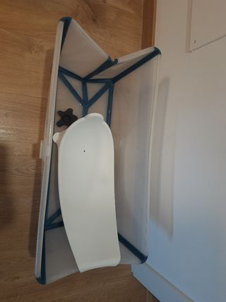 Soporte para bañera Stokke en perfecto estado. Ideal para bañar a tu bebé con comodidad y seguridad. - Diseño ergonómico y ligero. - Material plástico resistente y fácil de limpiar. - Se adapta a la mayoría de bañeras.