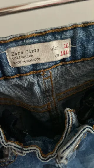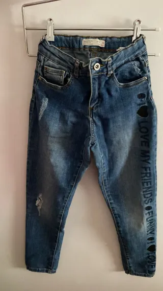 Pantalones vaqueros de Zara para niña en talla 10. Tienen un diseño moderno con detalles desgastados y un estampado lateral. - Talla 10. - Estampado lateral I LOVE MY FRIENDS FUNNY LOVE. - Efecto desgastado y rotos.