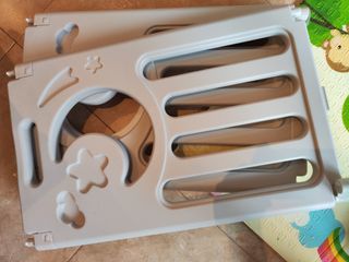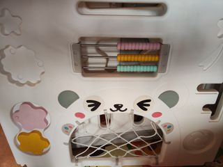 Parque de juegos infantil de plástico blanco con detalles de colores. - Incluye un ábaco con cuentas rosas, amarillas y turquesas. - Tiene un diseño de oso con mejillas rosas y orejas grises. - Cuenta con un panel con engranajes giratorios de color rosa y amarillo. - Incorpora una red de malla blanca.