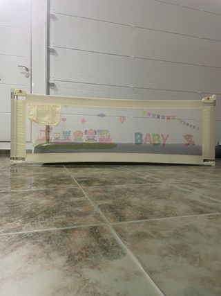Barrera de seguridad para cama de bebé, ideal para evitar caídas. - Diseño con estampado infantil. - Estructura de tela y metal. - Color beige y blanco. - Medidas especiales 70 x198 - Altura regulable