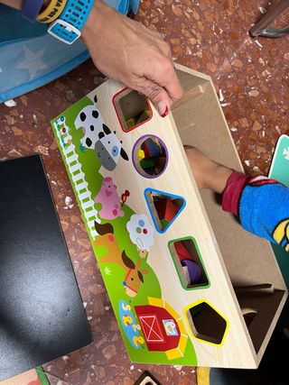 Es una caja de madera que posee múltiples funcionalidades para ser usado de la manera que tu niño o niña desee. Dentro de este, contiene piezas para completar distintos puzzles y realizar construcciones. Viene con tablillas para completar rompecabezas. El material predominante de cada pieza es una madera liviana y lisa. Algunas de estas piezas de madera vienen con estampados de números y letras en distintos colores para que los niños y niñas comiencen a aprender los números, colores y se familiaricen con las distintas letras del vocabulario español. Dimensiones de la caja: 18.73 cm x 18.5 cm x 37.0 cm.