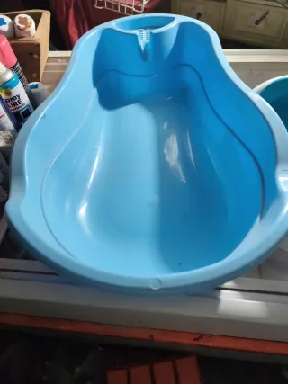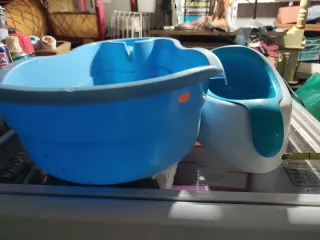 Conjunto de bañera y orinal para bebé en color azul. - Bañera con borde gris. - Orinal blanco con detalles en azul.