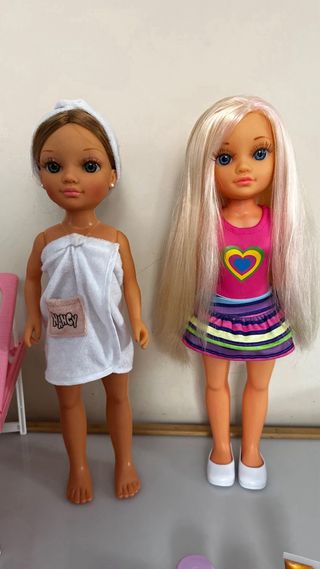 Lote de dos muñecas Nancy, una con temática de spa y otra de mechas. - Muñeca Nancy Un día de spa con toalla y accesorios, sin jugar con ella, se incluyen los accesorios de la foto. - Muñeca Nancy haciendo mechas, muñeca en perfecto estado. - Incluye camilla de spa y varios accesorios de belleza.