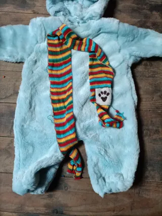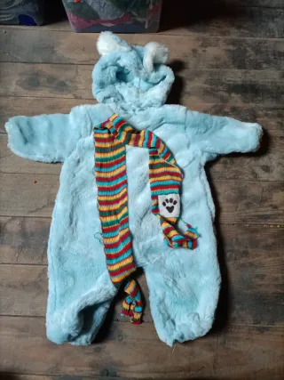 Adorable disfraz de osito de peluche para bebé. Perfecto para los más pequeños. - Mono completo de peluche azul. - Capucha con orejitas. - Incluye bufanda a rayas con huella de patita.