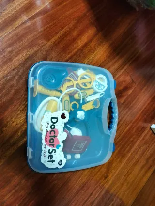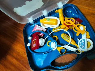Kit de médico de juguete para niños, con varios accesorios para jugar a ser doctor. - Maletín azul. - Incluye estetoscopio, jeringuilla, termómetro y otros accesorios médicos de plástico. - Diseño colorido y divertido.
