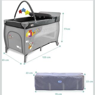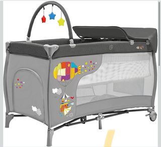 Parque cuna comprado en noviembre de 2025, se encuentra sin uso. Factura disponible. Costo alrededor de 80 € - Diseño con estampado de globo aerostático y nubes. - Incluye arco de juegos con estrellas colgantes. - Laterales de malla para ventilación. - Cambiador acoplable en la parte superior.