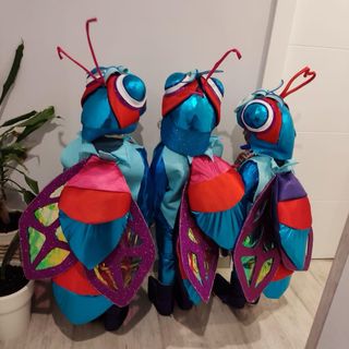 Disfraz de mosca hecho a mano, ideal para fiestas o eventos. - Diseño único y original. - Colores vibrantes en azul, rojo y morado. - Incluye traje completo con alas y antenas. - Precio por unidad