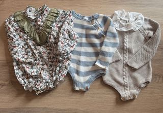 Conjunto de tres peleles para bebé, ideales para la talla de 18 a 24 meses, perfectos para primavera. - Pelele con estampado de jirafas y volantes verdes, de la marca Iló-Liló. - Pelele de punto a rayas azules y blancas, de la marca Unit talla 18 meses amplia. - Pelele de punto beige con cuello blanco y trenzado, de la marca Unit talla 18 meses amplia.
