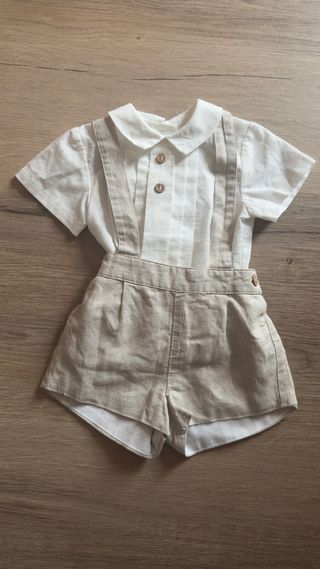 Conjunto de dos piezas para bebé niño, ideal para ceremonias o eventos especiales, puesto una única vez, de la marca Miranda. - Camisa blanca de manga corta con cuello - Peto corto de tela color beige - Cierre con botones en la camisa y en el peto