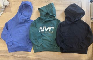 Conjunto de tres sudaderas de la marca H&M, talla 1a1/2-2 años, dan talla. - Sudadera azul lisa. - Sudadera verde con estampado NYC y texto Timber F.C. New York 1977. - Sudadera negra lisa.
