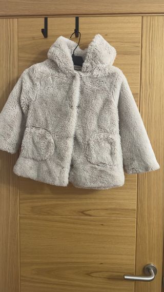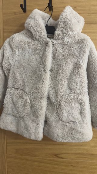 Abrigo de pelo suave para niña de Zara, talla 3-4 años. Es muy calentito y cómodo. - Diseño con capucha. - Cierre de botones. - Dos bolsillos delanteros.
