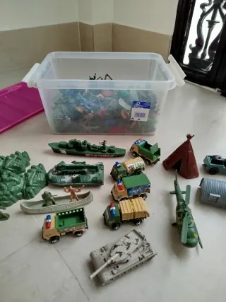 Conjunto de juguetes militares de plástico, ideal para coleccionistas o para jugar. - Incluye figuras de soldados, helicóptero y accesorios. - Diversos colores como verde, rojo y azul. - Contiene un túnel gris y elementos de terreno.