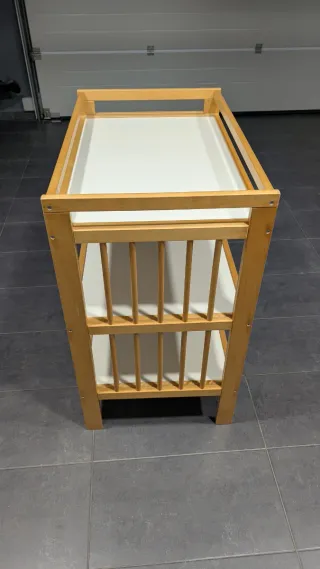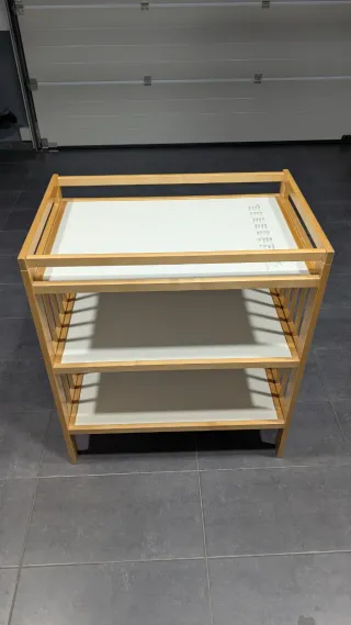 Cambiador de bebé de madera de Ikea, práctico y funcional. - Estructura de madera clara. - Bandejas blancas. - Diseño sencillo y seguro.