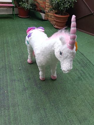 Unicornio de peluche grande, ideal para decoración o juego. - Color blanco principal. - Cuerno rosa con detalles plateados. - Melena y cola rosas. - Lazos de colores en la parte trasera. - Patas rosas.