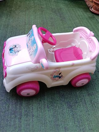 Coche de juguete para niñas con diseño de princesas. - Color principal blanco con detalles en rosa. - Volante rosa. - Asiento rosa. - Ruedas rosas. - Decorado con imágenes de princesas. -Lleva pedal de aceleracion.
