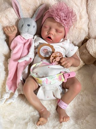 Preciosa bebé Reborn con una sonrisa encantadora. ⚖️ Peso: aprox 2,2 kg. 📏 Tamaño:/47cm aprox. ——— 🪶 Detalles que la hacen especial: ✨ Relleno de ecovidrio y miraguano, con caída de cabecita y movimiento como un bebé. ✨ Extremidades de vinilo y cuerpo de tela suave para mayor realismo en los movimientos. 🎀 Incluye todo lo siguiente: 👗 Ropa de la imagen de regalo 🎀 Lacito del pelo 🍼 Chupete imantado 💎 Cadena para el chupete aleatorio ✨ Pendientes (se pueden quitar) 🧷 Pañal 💕 Pulsera del hospital 🌙 Muselina para envolver al bebé (modelo aleatorio). ------------------ ❌No incluye peluche ❌No negociable