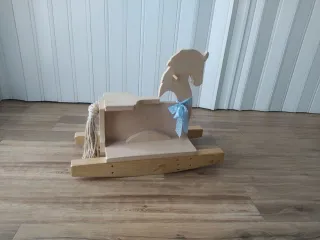 Caballito balancín hecho a mano, perfecto para decorar. - Fabricado en madera. - Detalle de lazo azul con lunares blancos.