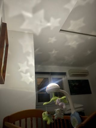 Móvil para cuna de la marca Fisher-Price con proyector nocturno de estrellas que se reflejan en el techo y paredes - tiene 3 opciones de sonidos(ruido blanco,sonido de naturaleza y canciones de cuna hasta con 30 minutos de reproducción -incluye mando a distancia todo en perfectas condiciones -los ositos tienen función giratoria