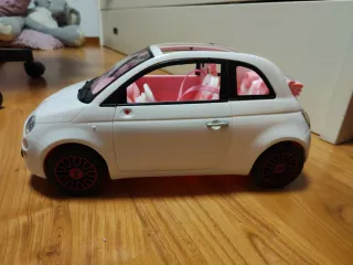 Coche de juguete Fiat 600 de Barbie, en muy buen estado y con poco uso. - Diseño inspirado en el Fiat 600. - Detalles en color rosa. - Incluye placa frontal Barbie.