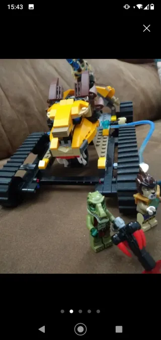 Set de construcción Lego Chima con un vehículo tipo tanque. - Diseño principal en color amarillo. - Incluye figuras de personajes. - Ruedas tipo oruga.
