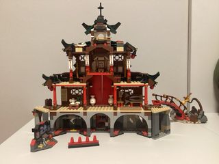 Set de construcción Lego Ninjago. Incluye 8 figuras lego, un gran tenplo ninjago, un vehículo de los malos y un robot.80