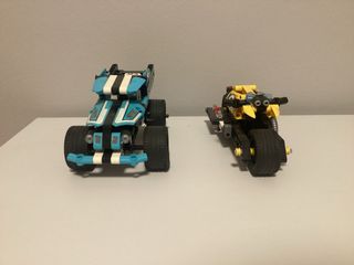 Set de construcción Lego con un coche y una moto. - Coche de color azul y blanco con detalles negros. - Moto de color amarillo y negro. Los dos vehículos si los pones hacia atrás, se van hacia alante un trozo ellos solos