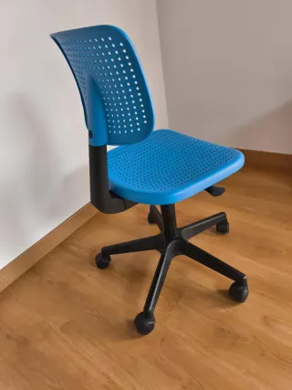 Silla de escritorio con un diseño moderno y juvenil. - Color azul vibrante. - Base con ruedas para fácil movilidad. - Respaldo y asiento perforados.