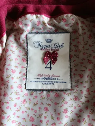 Abrigo de la marca Tizzas Girls, talla 4. Ideal para completar el armario. - Diseño con forro estampado floral. - Cierre con botones. - Detalle de lazo en la parte delantera.