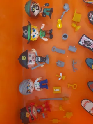 Lote de figuras Pin y Pon con accesorios y minipatinetes. - Figuras de personajes variados. - Incluye accesorios como herramientas y llaves. - Varios minipatinetes con diseños. - Ideal para coleccionistas y juego.