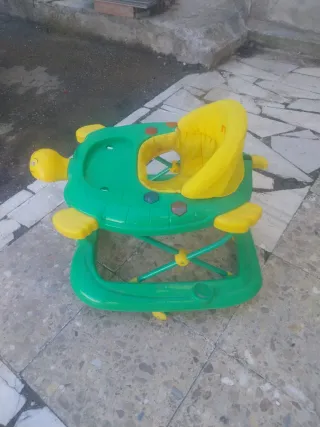 Andador para bebés con diseño de tortuga. - Color verde y amarillo. - Asiento acolchado. - Ruedas giratorias.