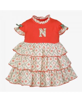 Vestido polo para niña con un diseño marinero. Talla 12 meses - Cuerpo superior de color naranja. - Falda con volantes y estampado de anclas y timones. - Detalle de la letra 'N' bordada en el pecho. - Lazos verdes en las mangas.