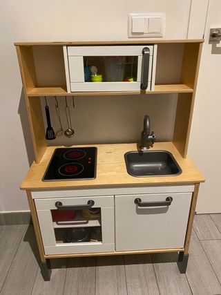 Cocinita infantil IKEA DUKTIG + Pack Completo de Accesorios 🧑🍳 ¡Ideal para mini chefs! Vendo cocina de madera en muy buen estado. Incluye la placa con luces LED funcionales y patas regulables en altura. Súper pack incluido: ✅ Ollas, sartenes y colador de acero. ✅ Utensilios de cocina colgantes. ✅ Batidora de vaso y sandwichera de juguete. ✅ Vajilla (vasos/tazas) y comida variada (frutas, verduras, hamburguesa). ✅ Cestas de almacenaje. Limpia y lista para jugar. Un regalo perfecto que fomenta la imaginación.