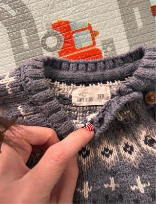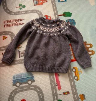 Jersey de punto para niño de la marca Unit Kids, talla 36 meses. Diseño clásico con cuello redondo y botones en la parte superior. - Color gris marengo- azulón - Estampado geométrico en el cuello. - Puños y bajo de canalé.