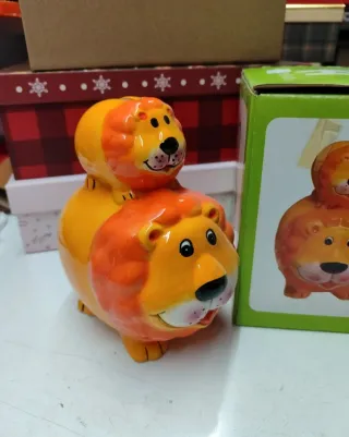 Adorable hucha decorativa con diseño de dos leones apilados. Fabricada en cerámica brillante. NUEVA - Diseño de leones. - Color naranja y amarillo.