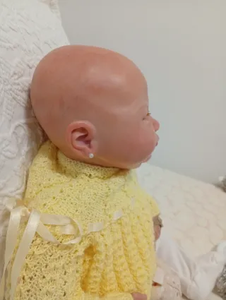 Muñeca de bebé realista con detalles muy cuidados. - Vestido de punto amarillo con lazos. - Pendiente de perla en la oreja.