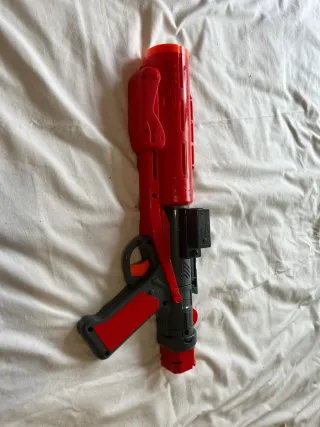 Pistola de juguete con un diseño llamativo en rojo y negro. - Empuñadura ergonómica. - Detalles en gris y naranja.