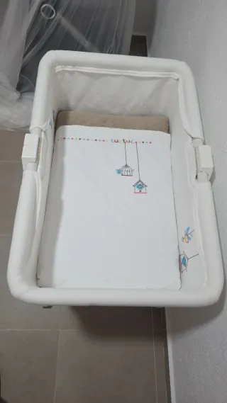 Mini cuna blanca con estructura de madera y ruedas Algun rosesillo pero se puede arreglar con un poquito pintura queda nueva nada importante - Incluye colchón y vestidura. - Diseño moderno y funcional. - Fácil de mover por la casa.